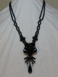 二重にスカシパーツを使い、ジェットカラーのラウンドビーズとフラットタイプの五枚のシズクで囲い直径35ミリの花を作っています。ペンダントの下に配したシズクもアクセントとなります。(重サ 33g)