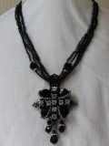 中心に5ミリのラインストーンをクロス型に配しブラックカラーのビーズで製作しました。ネックチェーン部は同系カラーのビーズを四連にしてカニカンとアジャスターでまとめた、ボリューム感たっぷりなネックレスです。(重サ 43g)